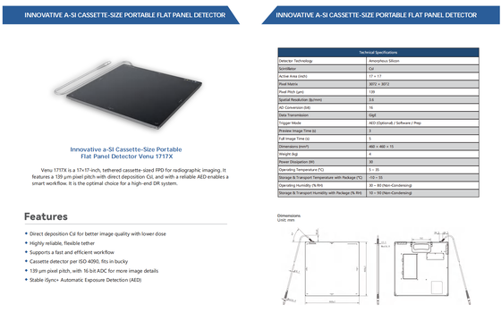 This advanced flat panel detector features a 17x17-inch active area and utilizes amorphous silicon technology for superior imaging performance. The detector is fully DICOM compatible, ensuring seamless integration with medical imaging systems and workflows.